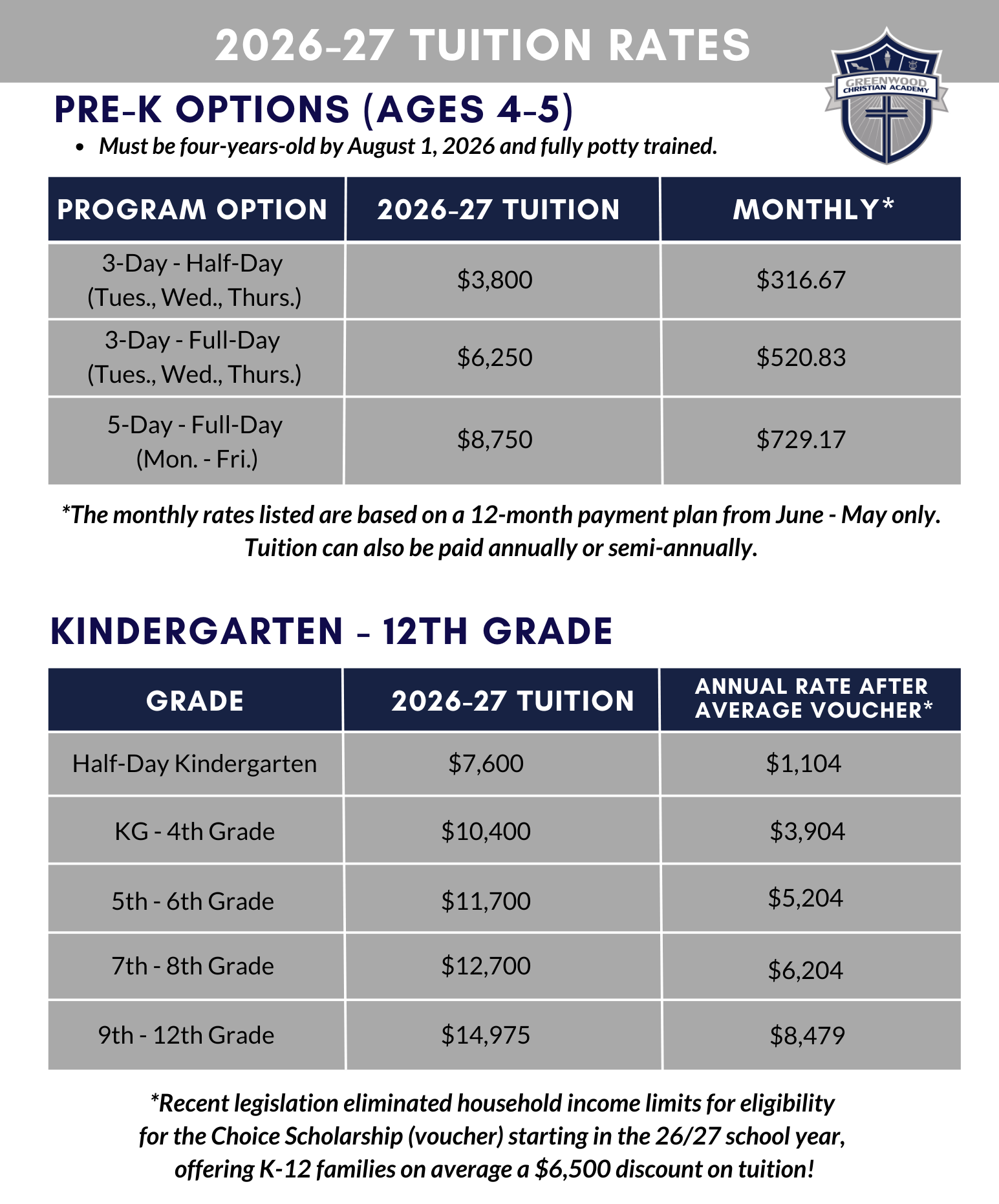 A School Choice Scholarship (voucher) enables families of students in grades K-12 to use public funds to pay for some of their child’s private school tuition. Vouchers are created and distributed by the state government, and new this year – there are NO household income limits. These scholarships will provide a credit of $6,400 - $7,400 back on your tuition bill based on your home school district! The application deadline for the 26/27 school year is September 1, 2026.